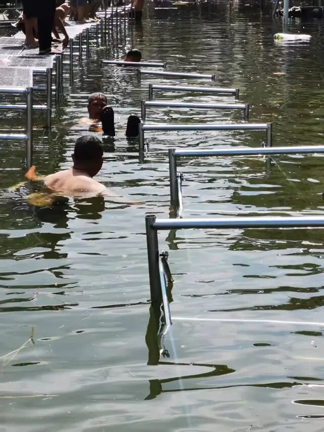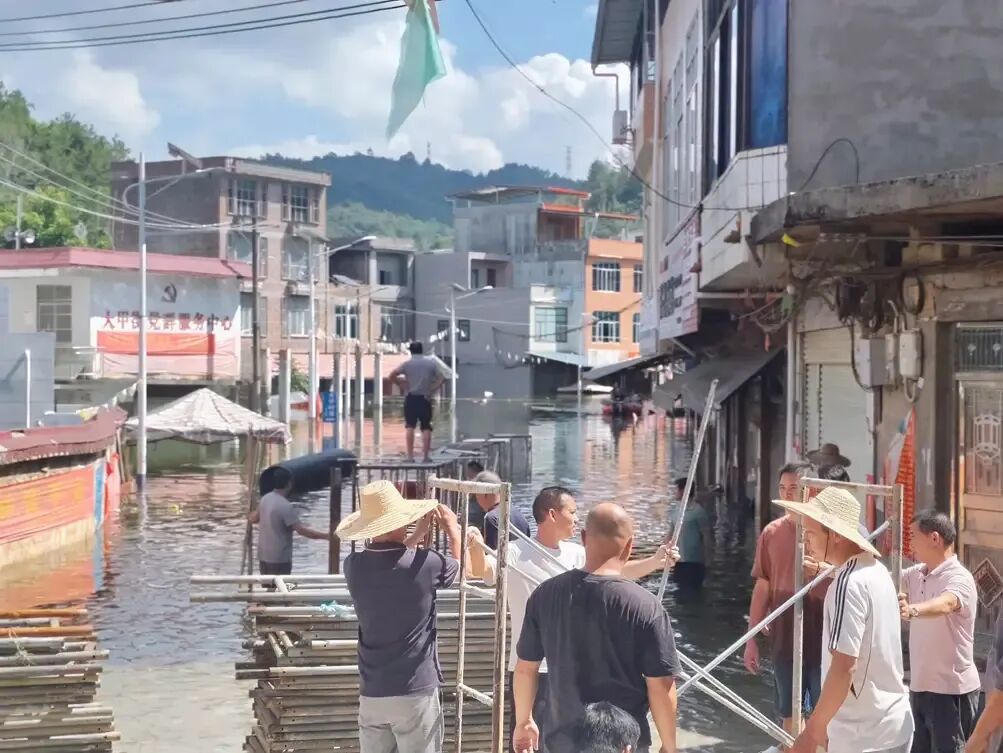 大甲街的人早上一睁眼,就是看天气。要是下小雨,估摸得涨三四公分,要是下阵雨,估摸得涨五公分。一个搞装修生意的中年男人,每天在自家楼梯上做标记。他也参与了搭桥,之后又划着竹筏,把两名80多岁的老人接出来——老人执拗,“哪儿也不去”,只能由孙子划着竹筏去送饭,每天要跑五六趟。花了两天,终于劝动他们去亲戚家住。那时候水已经没过门楣,没法划着竹筏进去,只能绑上电工的安全带,从阳台进出。