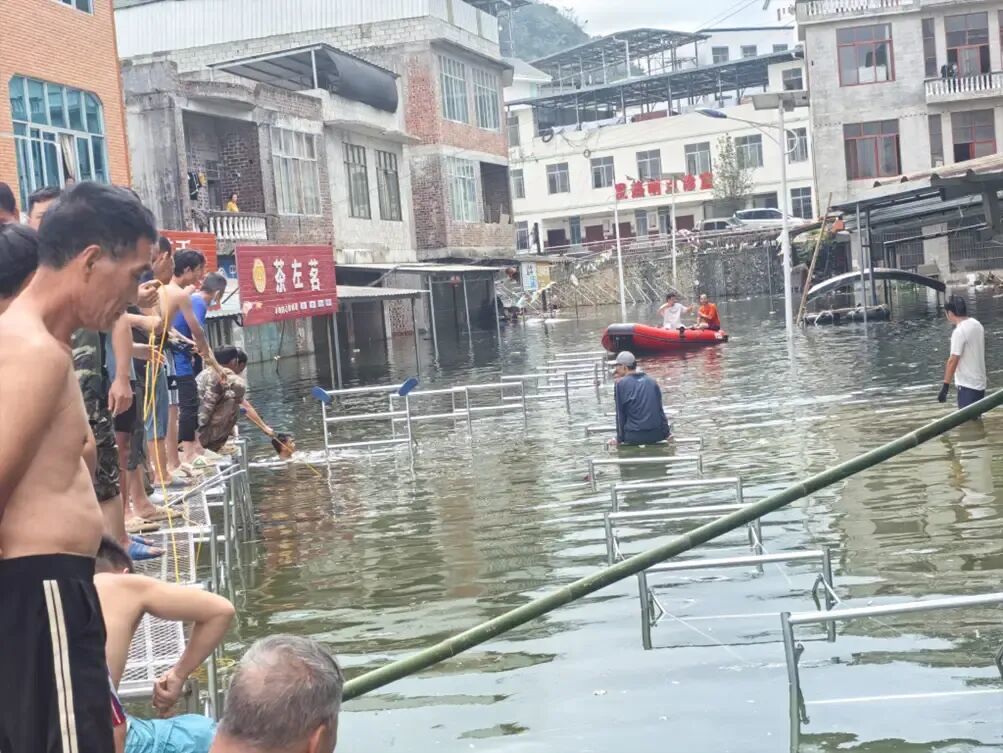 起初两天,快递送不了,他用皮划艇送人。大甲街是这一带的商贸中心,三个老人喉咙痛,要去卫生院看病,七八个中年妇女要去买青菜猪肉,都是他送。有老人划车轮胎去买东西,结果“挨翻了”,掉到水里。